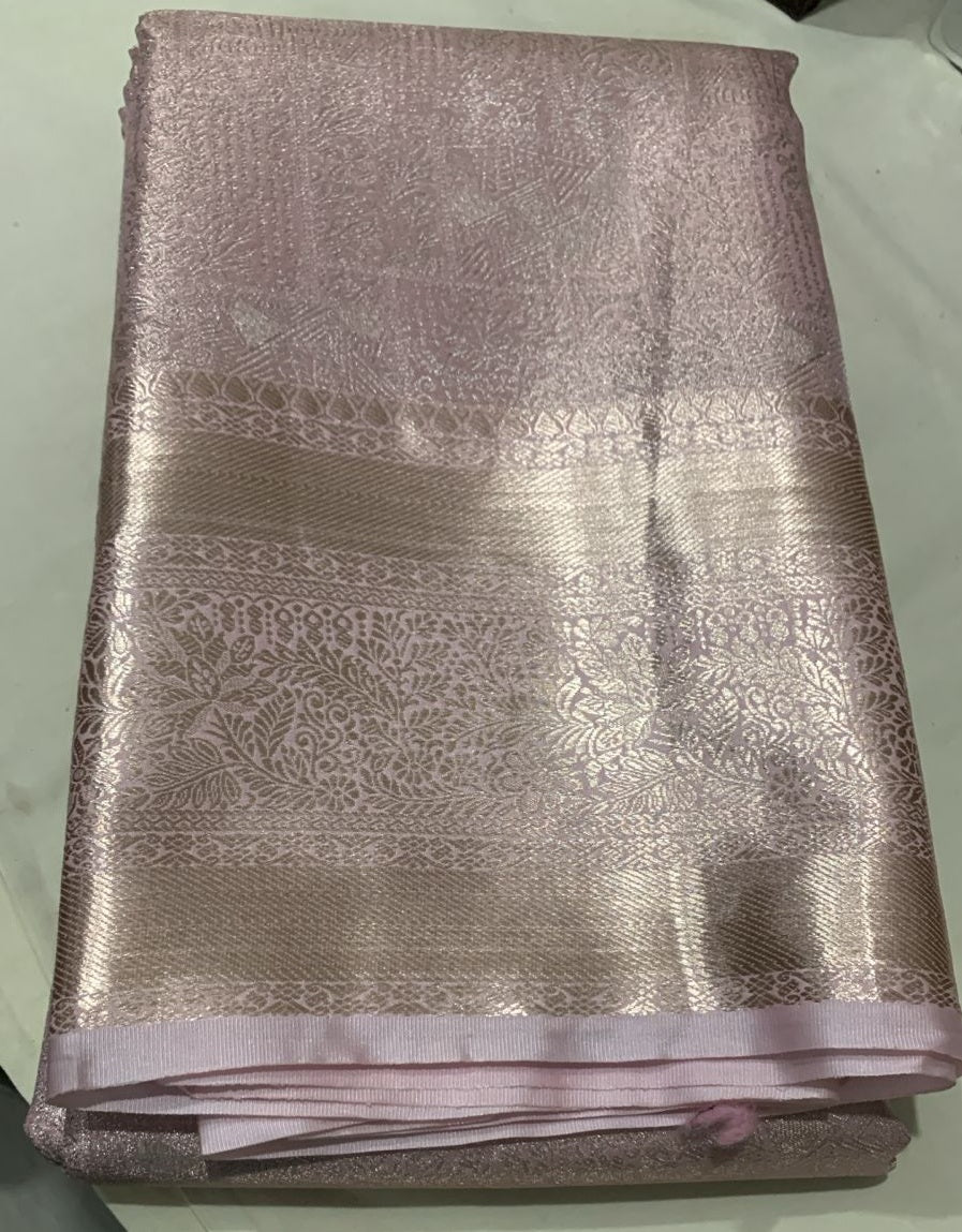 Grace meets grandeur in this Kanchi tissue brocade semi silk saree, crafted in a soft pastel shade with all over floral brocade Zari weaving. The rich pallu adds a regal touch, while the coordinated blouse completes the look effortlessly.